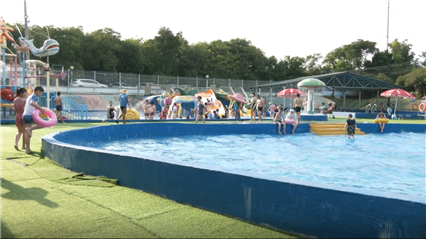 走进水上乐园记者看到,许多游客带着家人朋友沉浸式体验,造浪池、大桶水淋、儿童滑梯、游泳池等游玩设施,许多家长和小朋友穿梭其中,在炎炎夏日里尽情享受清凉一“夏”。