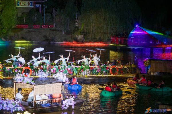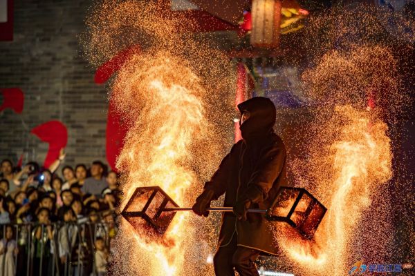 除了经典的京剧演唱,公园内的其他主题节目也同样引人入胜。水中花船上,水上歌舞《水韵楚风》以湖光山色为天然幕布,舞者衣袂飘飘,宛若惊鸿,与自然景观完美融合,构成一幅灵动的画卷,引得游客纷纷驻足、大声喝彩。谭鑫培戏楼前,非遗项目“火壶表演”惊险奇绝,表演者将盛有热炭的铜壶舞得虎虎生风,炭灰与火焰交织,展现着力与美的平衡,令围观游客惊叹连连。