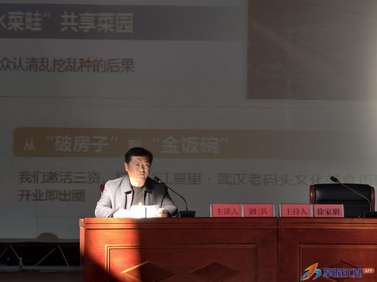 活动现场,刘兵书记以《锦绣山前织“锦绣”,织出清明上河图》为主题,用朴实的语言和鲜活的案例,全景式展现了锦绣村的蝶变历程。曾经的锦绣村面临“绿化带变菜园、景观树成晾衣架”的治理困境,年轻人外流、资源闲置。近年来,该村坚持党建引领,成立强村公司,以“村集体控股+村民小组参股”模式盘活38栋闲置房屋和110余亩土地,成功打造“江夏里·武汉老码头”文化美食街区。该项目开业爆火,迎客百万,锦绣村也实现村集体经济收入飞跃,获评全国乡村治理示范村等10余项荣誉。