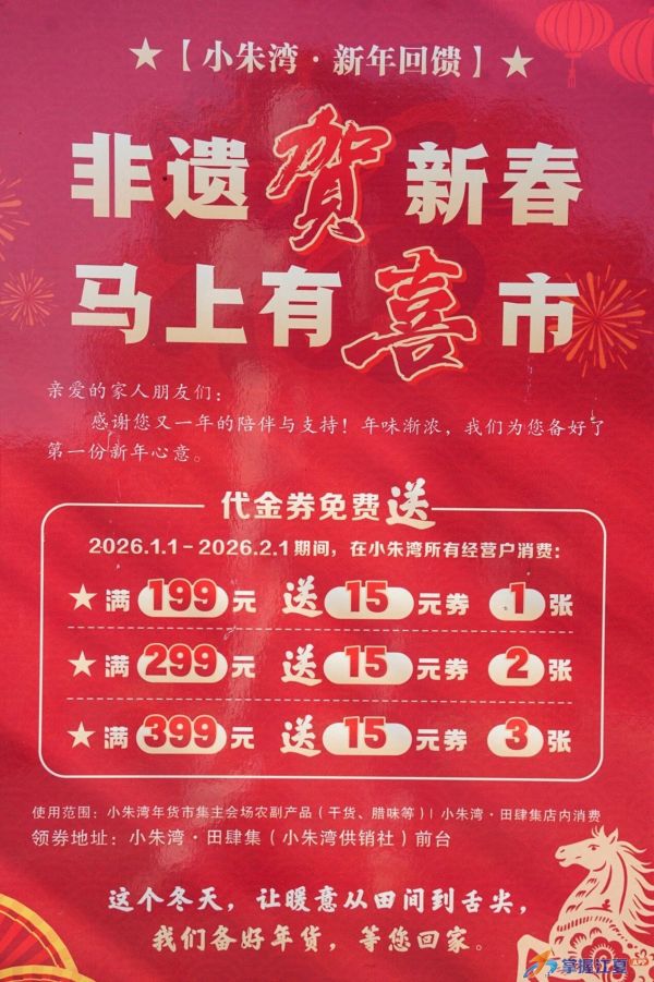 代金券使用范围:小朱湾年货市集主副会场、田肆集内通用。