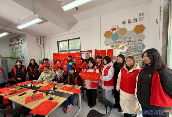 1月21日下午2小时,在桥南社区户外工作者驿站,由武汉市江夏区社会工作部组织的红骑侠志愿服务队、长江工程职业技术学院为居民写春联活动热闹开场。红骑侠志愿服务队和其他志愿者10余人发挥才艺,铺纸研墨,挥毫泼墨,用遒劲秀美的笔锋送去对社区居民诚挚的新春祝福。平日握惯餐盒、快递件的手,拿起毛笔虽有几分生疏,却格外认真,平添了几分风雅,收获了周围许多羡慕的眼神。