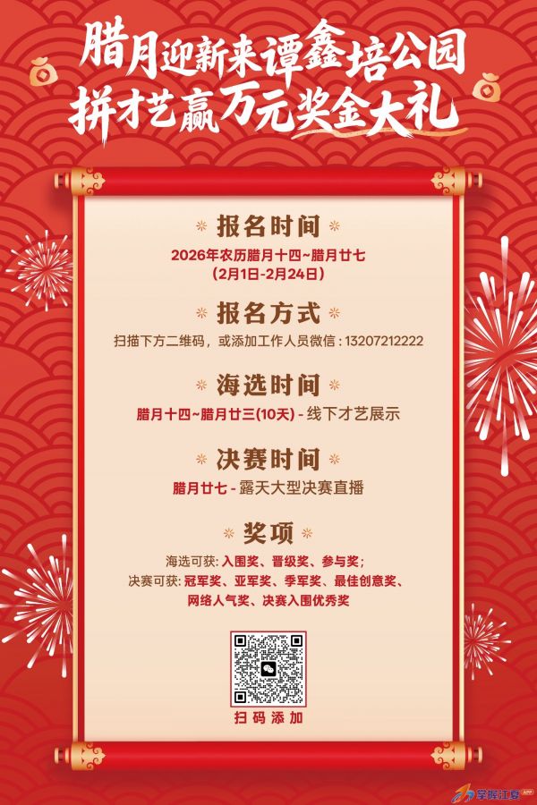 值此腊月迎新之际,谭鑫培公园“江夏味·中国年”春节民俗系列活动打造百姓大舞台才艺比拼大赛,以京剧文化为底蕴,以喜庆年味为舞台,举办全民才艺竞演盛会。这不仅是一次才艺的比拼,更是江夏文化活力与时代创新魅力的集中展现。万元奖池已备,期待您的闪耀登场!
