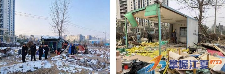 行动当天,尽管气温低至-2℃并伴有中度雾霾,执法人员仍提前布置警戒、做好防护,有序开展拆除作业。在保利和光晨樾周边,临时搭建的塑料大棚、破旧板房等也被逐一拆除清运;沿线零散违规棚屋也同步清理并完成场地平整。整个行动规范高效,累计拆除违规搭建5处,清理各类建筑垃圾及杂物约2吨,有效提升了道路沿线环境面貌。