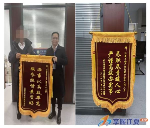 近日,江夏区不动产登记窗口收到中国光大银行武汉分行、武汉信用风险管理融资担保有限公司赠送的两面写着“办事认真效率高、服务热情素质好”“尽职尽责暖人心、严谨高效办实事”的锦旗。