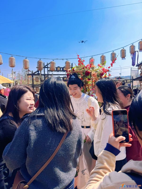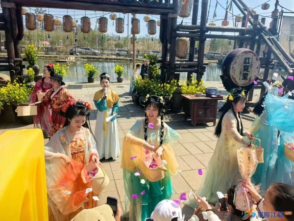 今年的启动仪式别具匠心。码头春典游园会上,身着汉服的“卖花郎”背着花篓穿行街巷,与游客对诗互动;不远处,来自五里界机关、村、社区的十二位“花神”衣袂飘飘,参照《周礼·春官》复原百花祀典,抛洒花瓣入水,引得游客纷纷举起手机,定格这诗意瞬间。