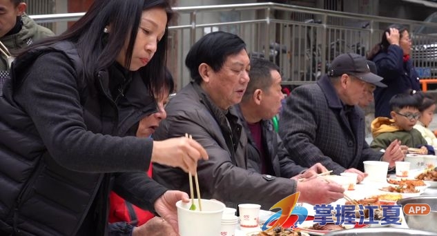 临近中午,长桌渐满,百家宴正式开席。各式家常菜肴色泽诱人、香气浓郁,居民们围坐一起,一边品尝邻里的手艺,一边闲话家常。席间仍有居民不断端来刚做好的菜品,引来阵阵欢声与称赞。