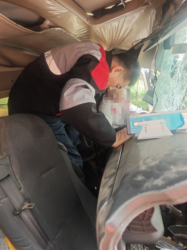 三人立即停车分工施救。张小强和焦浩守在司机窗前安抚情绪:“别怕,救援马上到。”刘涛则迅速设置警示标识,拨打122、120、119,并用独臂疏导车流,维持秩序。随后,他还联系上司机所在公司,告知事故情况。