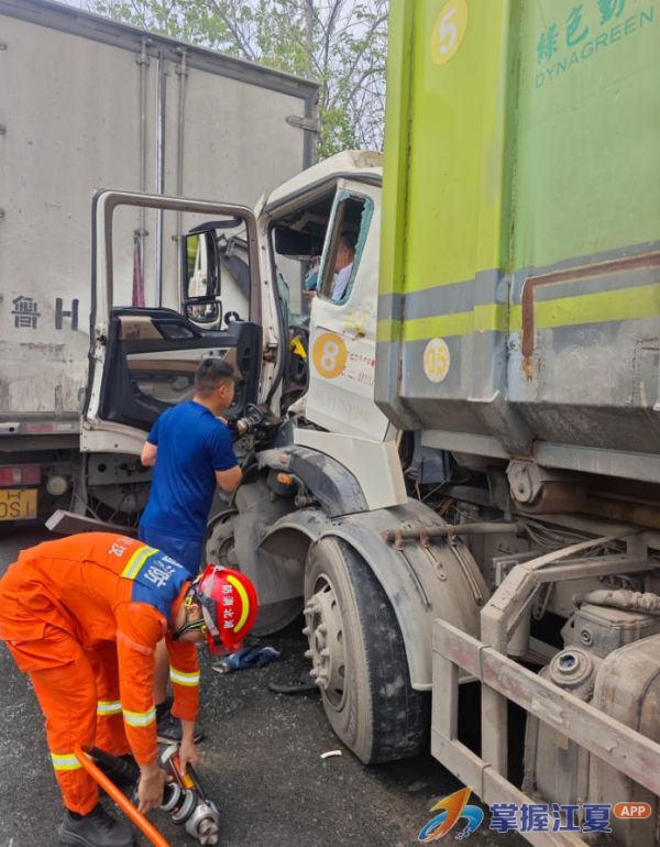 4月17日中午12时许,武汉江夏“红骑侠”刘涛、张小强、焦浩在参加完高校座谈会返程途中,行至三环线光谷往白沙洲方向黄家棚天桥路段时,发现一辆垃圾车横在路中央,驾驶室严重变形,司机被卡住无法动弹,情况危急。