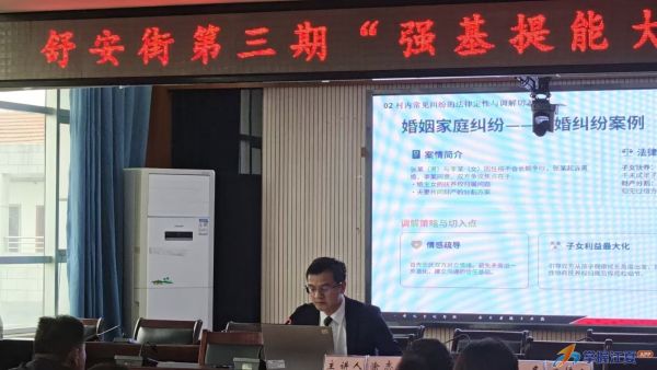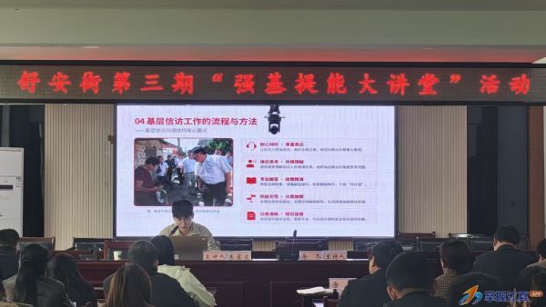 4月23日下午,舒安街第三期“强基提能大讲堂”在街道三楼会议室开课。本期以“强基提能,业务练兵——基层治理法治化专题培训”为主题,聚焦基层治理堵点难点,通过法治思维与专业能力“双轮驱动”,进一步推动街村干部综合履职能力提升。各村(社区)党支部书记及负责人、网格员、驻村工作组全体成员、“小青安”读书网评小组成员参加培训。